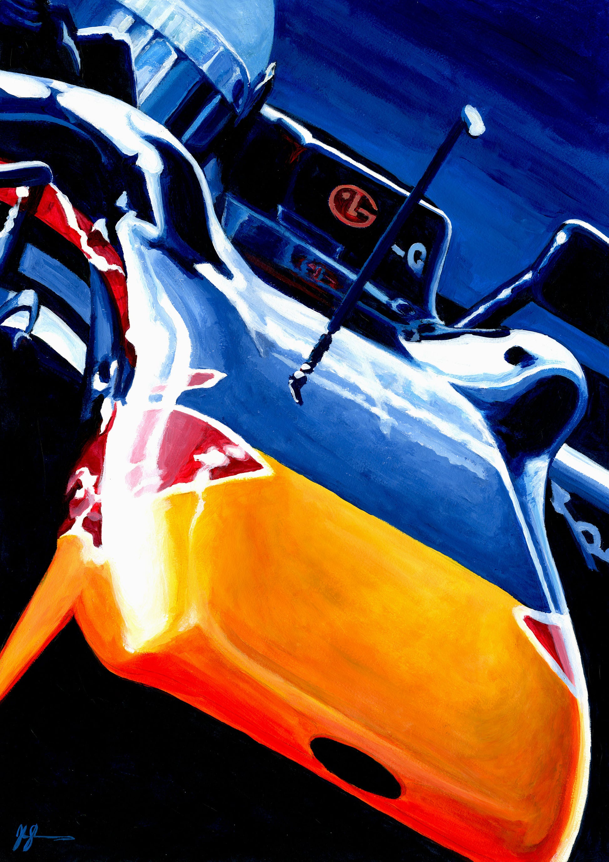 My painting of the beautiful Adrian Newey designed car that took both the 2010 Drivers’ and Constructors’ F1 titles. At the end of one of Formula One's most competitive season ever, which saw four championship contenders going into the final race of the season, it was Sebastian Vettel who came out on top. By winning his first title in 2010, he became Formula One's youngest ever world champion at the age of 23. Not stopping there, the Vettel / Newey-designed Red Bull combination went on to win three more championships in a row, through a period of sheer dominance. History was made.